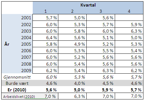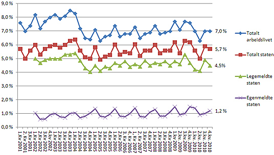 Ser vi på sykefraværstallene i 2001, som ligger til grunn for IA-avtalens delmål 1 om 20 prosents reduksjon, mangler vi data for sykefraværet i statlig sektor i 4. kvartal 2001. Men tabell 1 viser at sykefraværet 4. kvartal 2010 er identisk med gjennomsnittet for 4. kvartal på hele 2000-tallet (5,7 prosent), hvilket indikerer at nedgangen ikke er så stor som ønsket. Samtidig ligger statlig tariffområde lavere enn arbeidslivet som helhet.