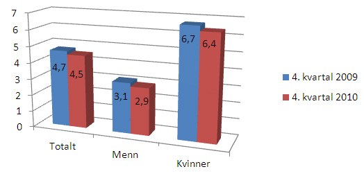 Figur 2: Legemeldt sykefravær 4. kvartal 2009 og 2010 blant kvinner og menn i staten. Prosent.