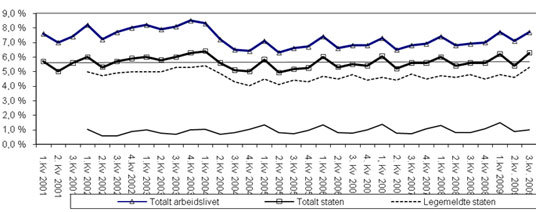 Figur 1: Legemeldt og egenmeldt sykefravær i staten og arbeidslivet totalt fra 2001 til 3. kvartal 2009: