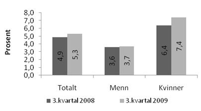 Det legemeldte sykefraværet for kvinner steg til 7,4 prosent. Det egenmeldte fraværet for kvinner steg fra 1,1 til 1,2 prosent. For menn økte det legemeldte sykefraværet med 0,1 prosentpoeng, mens det egenmeldte sykefraværet for menn steg fra 0,6 til 0,9 prosent fra 3. kvartal 2008 til samme kvartal i 2009.
