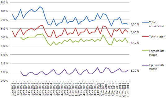For statlig tariffområde ser vi en liten nedgang i forhold til 4. kvartal 2010, mens arbeidslivet som helhet opplever en større nedgang. På Navs nettsider pekes det på at sykefraværet i arbeidslivet som helhet nå er det laveste på sju år.