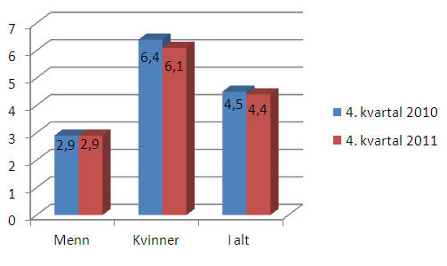 Figur 2: Legemeldt sykefravær 4. kvartal 2010 og 2011 blant kvinner og menn i staten. Prosent.