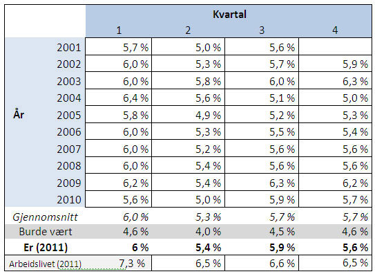 Tabell 1 viser at sykefraværet ligger noe under gjennomsnittet for 4. kvartal på 2000-tallet, dette er en positiv utvikling etter at tallene forrige kvartal var negative.