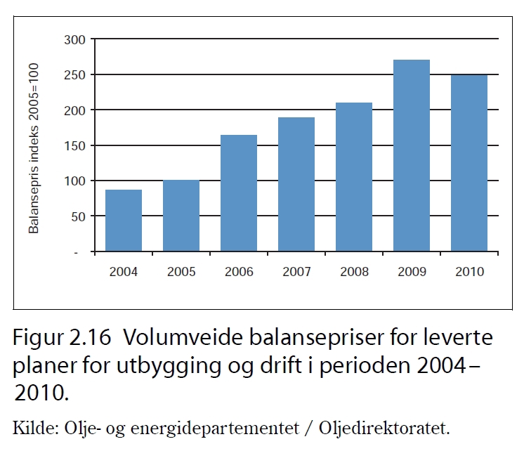 Figur 2.16 viser balanseveide priser for planer for utbygging og drift i perioden 2004-2010.