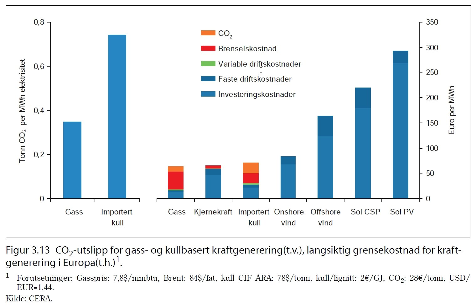 Figur 3.13 viser CO2-utslipp for gass- og kullbasert kraftgenerering (t.v.), langsiktig grensekostnad for kraftgenerering i Europa (t.h.).