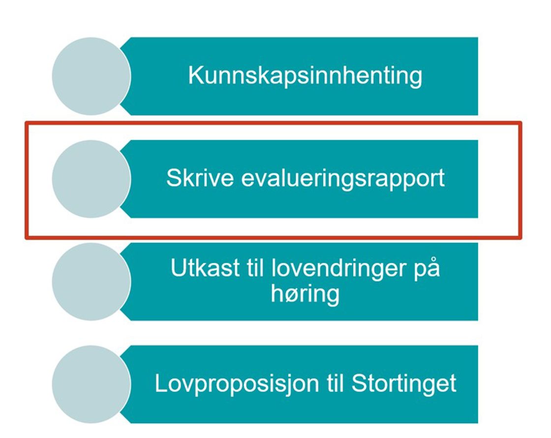 Barne- og familiedepartementet har startet arbeidet med å evaluere åpenhetsloven. Figuren under viser hvor departementet er i evalueringsprosessen.