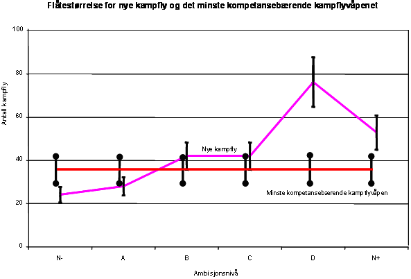 I antallsberegningen i alternativanalysen er det tatt utgangspunkt i ambisjonsnivåer for kampflyvåpenet som spenner fra det lite ressurskrevende til det meget ressurskrevende. Ambisjonsnivåene representerer kampflyleveranser til nasjonale og internasjonale operasjoner. Foruten to rene nasjonale nivåer, så innebærer nivåene en mulighet for kombinert nasjonalt og internasjonalt bidrag. Antallet kampfly kan ikke underskride antallet knyttet til begrepet det minste kompetansebærende kampflyvåpenet – i størrelsesorden 27-42 kampfly (dette antallet inkluderer erstatningsfly). Dette innebærer at selv om enkelte ambisjonsnivåer krever færre enn i størrelsesorden 27-42 fly, så må man fremskaffe minst dette antallet. Dette kan fremstilles med følgende figur: