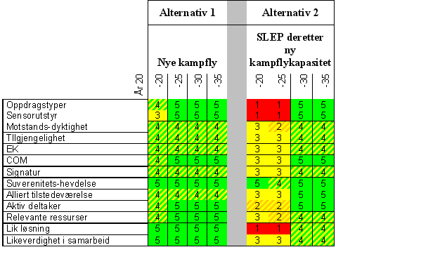 Tabell 1 Alternativenes oppfyllelse av kravene mellom 2020 og 2035. Vurderingene for alternativ 1, Nye kampfly, er basert på et gjennomsnitt av spennet av ytelser for nye kampfly. Dette er gjort for å vise hvordan ytelsen til nye kampfly er i forhold til levetidsforlengede kampfly. Analysen viser at selv om de nye kampflyene har ytelse som varierer, så har ingen av kandidatene en ytelse som er like dårlig som for levetidsforlengede kampfly.