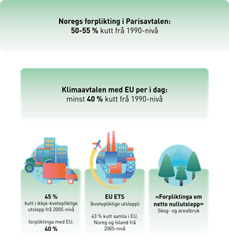 Norge har inngått en klimaavtale med EU for å samarbeide for å oppfylle målet. Avtalen innebærer at Norge deltar i EUs klimaregelverk som er delt inn i tre pilarer: 1) Ikke-kvotepliktige utslipp, 2) kvotepliktige utslipp og 3) skog og arealbrukssektoren. CO2-opptaket i skog er med i den tredje pilaren, og vi har egne regler for hvordan opptaket skal regnes inn.