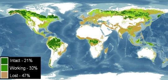 Verdens skogareal utgjør i følge FNs organisasjon for ernæring, landbruk, skogbruk og fiskeri (FAO) ca 30% av verdens landarealer, eller like under 40 millioner km2. Verdens største skogområder finnes i dag i Russland og Canada, og i det tropiske beltet rundt ekvator. Verdens største tropiske naturskoger er regnskogene i Amazonas i Sør-Amerika, Kongobassenget i Afrika og skogene i Indonesia og Malaysia.