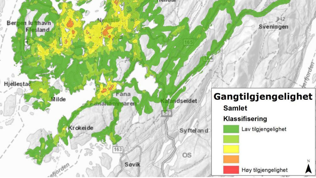 Eksempel på tilgjengelighetskart fra rapporten "Gangveger i Bergen Utarbeidelse av gangnettverk og tilgjengelighetsanalyse fra Asplan Viak".