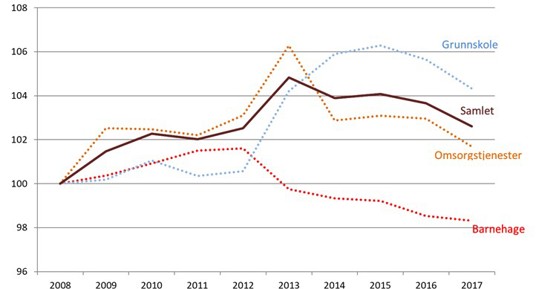 Figur 1 viser utviklingen i beregnet effektivitet i perioden 2008–2023. Fra 2022 til 2023 var det en nedgang i effektiviteten i samtlige sektorer. Nedgangen var størst i pleie og omsorg (1,7 prosentpoeng). Nedgangen var litt mindre i grunnskole (1,5 prosentpoeng) og barnehage (1,3 prosentpoeng). For de tre sektorene samlet ble effektiviteten redusert med 1,6 prosentpoeng.