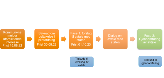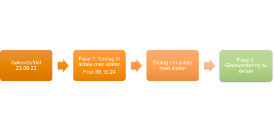 Med denne utlysningen kan det søkes om inntil 2 millioner kroner til fase 1 for å forberede avtaleutkast med staten. Midlene kan benyttes i 2023 og 2024. Resultatet av fase 1 skal være utkast til hva kommunene ønsker å gjøre avtale med staten om. Utkastet skal foreligge innen 30. oktober 2024.