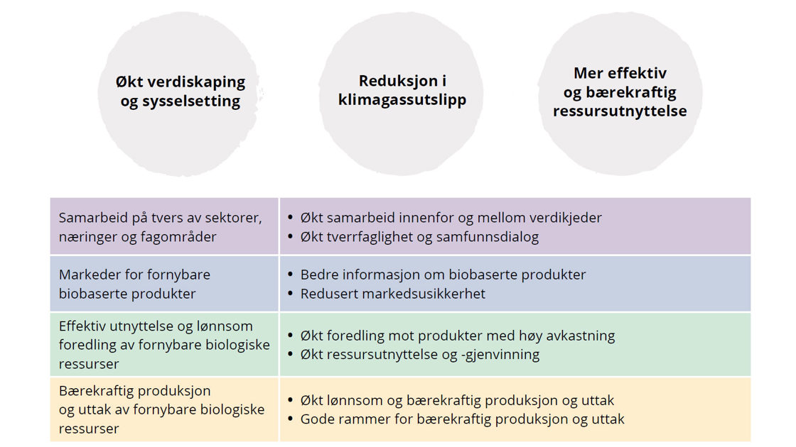 Den nasjonale strategien for bioøkonomi "Kjente ressurser – uante muligheter" skal fremme økt verdiskaping og sysselsetting, reduserte klimagassutslipp, og mer effektiv og bærekraftig utnyttelse av de fornybare biologiske ressursene.
