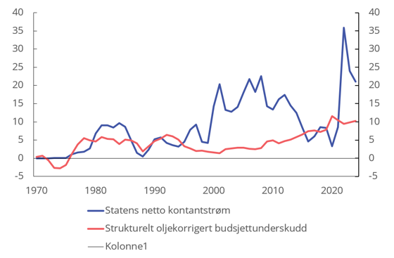 Figur 1. Statens netto kontantstrøm fra petroleumsvirksomheten og strukturelt oljekorrigert underskudd på statsbudsjettet. Prosent av trend-BNP for Fastlands-Norge