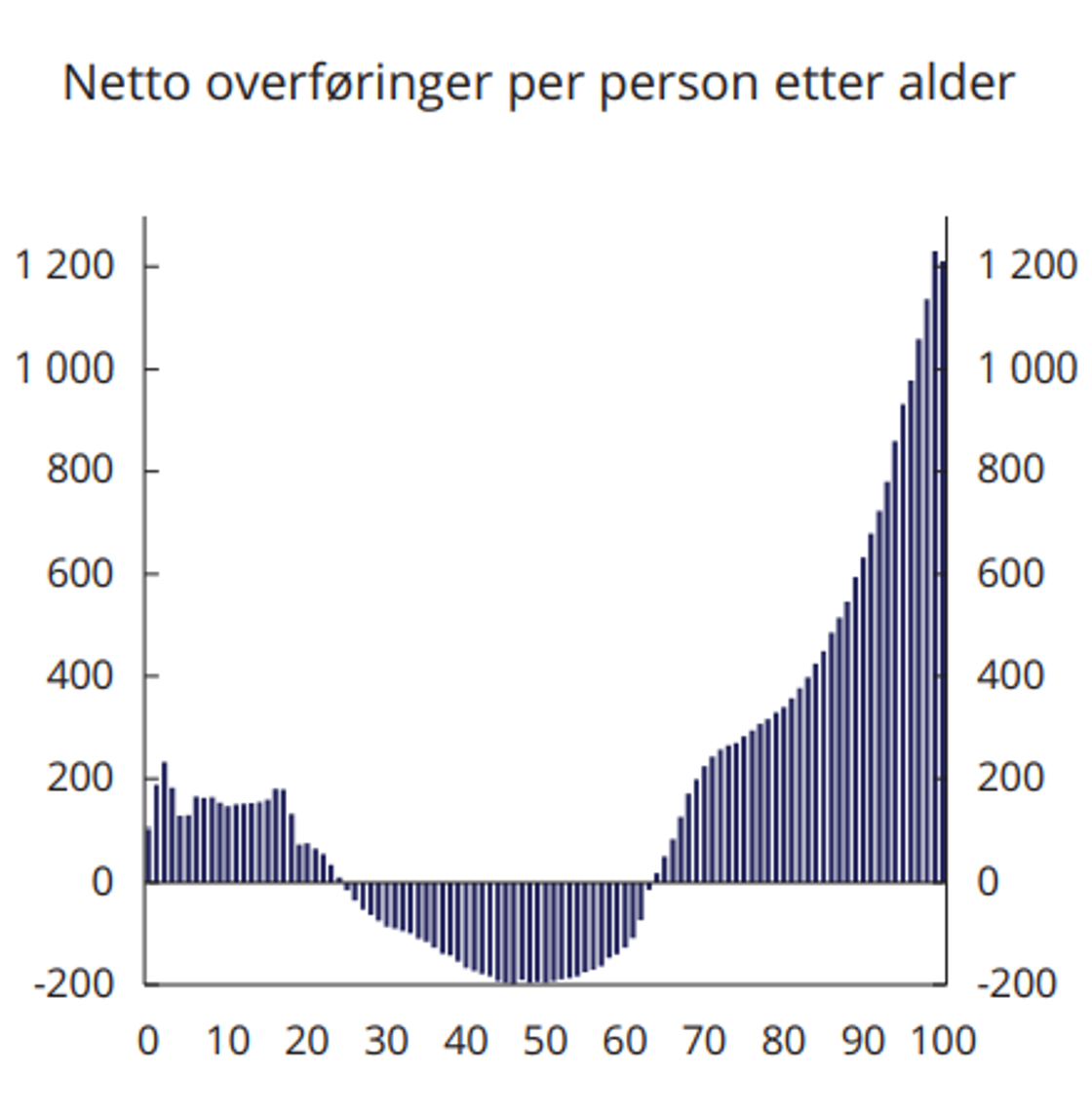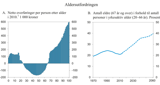 Velferdsstaten innebærer en betydelig omfordeling over livsløpet. Som barn, ungdom og eldre mottar vi mye offentlige tjenester og overføringer, samtidig som vi betaler mindre skatt. Da er vi netto mottakere av overføringer fra statsbudsjettet, se figur A. I yrkesaktiv alder betaler vi i gjennomsnitt mer i skatter og avgifter enn vi mottar. Da er vi netto bidragsytere. Dette mønsteret betyr at offentlige finanser påvirkes av endringer i alderssammensetningen av befolkningen.