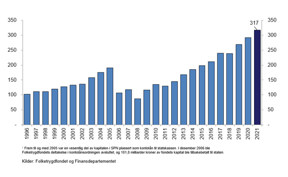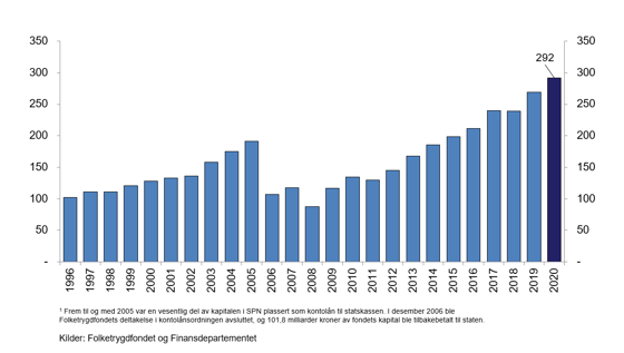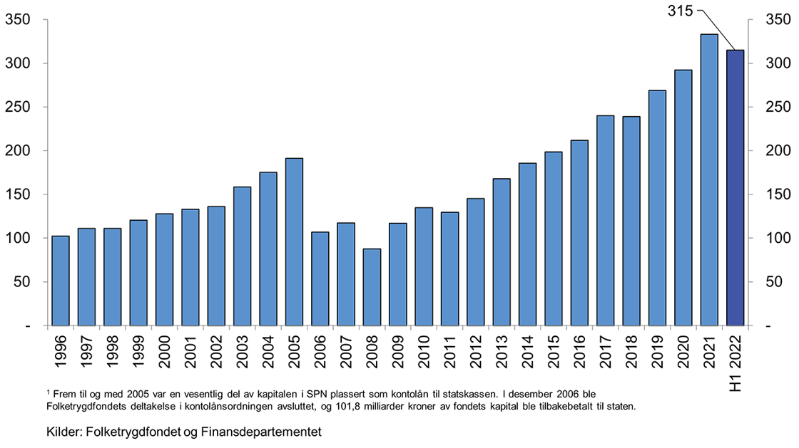 1 Til og med 2005 var en vesentlig del av kapitalen i SPN plassert som kontolån til statskassen. I desember 2006 ble deltakelsen i kontolånsordningen avsluttet, og i overkant av 100 mrd. kroner av fondets kapital ble tilbakebetalt til staten