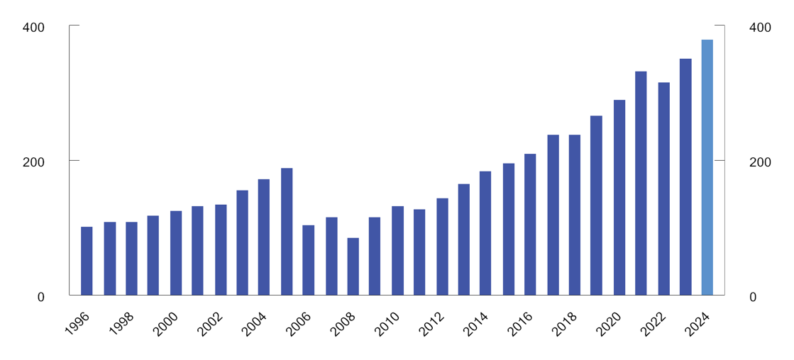 Utvikling i markedsverdien til Statens pensjonsfond Norge fra 1996 til 2024. Milliarder kroner 1