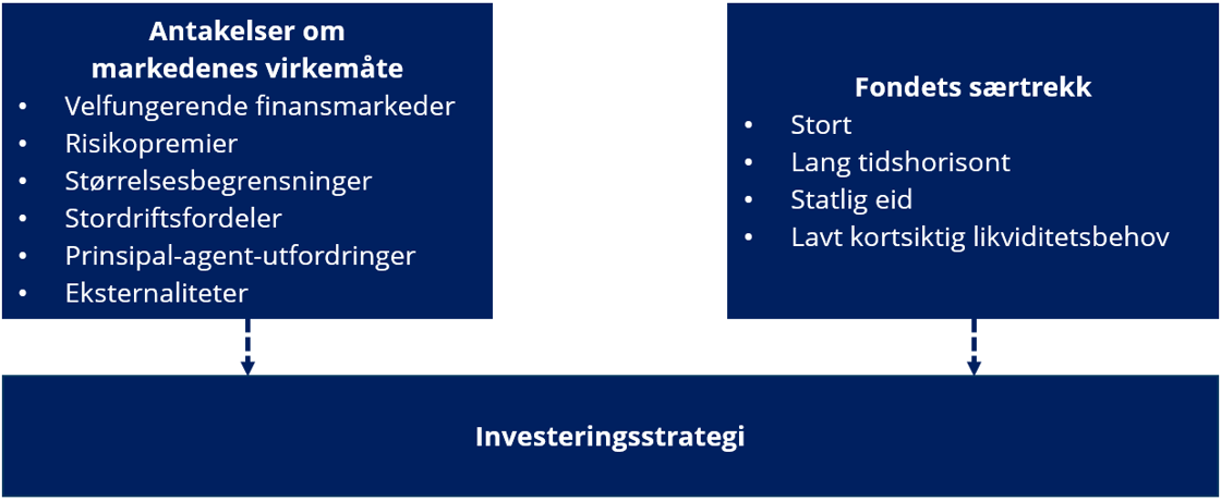 Investeringsstrategien er utformet med utgangspunkt i fondets formål og særtrekk, forvalters fortrinn og antakelser om hvordan finansmarkedene fungerer. Strategien er utviklet over tid basert på allment tilgjengelig kunnskap, forskning, praktiske erfaringer og grundige vurderinger. Viktige veivalg i forvaltningen av fondet forankres i Stortinget.
