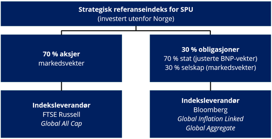 Fondets referanseindekser for aksjer og obligasjoner tar utgangspunkt i brede, globale indekser fra ledende indeksleverandører. Referanseindeksene gjenspeiler i stor grad investeringsmulighetene i de globale aksje- og obligasjonsmarkedene. Forvaltningen av SPU kan betegnes som indeksnær og avkastningen av fondet følger i hovedsak av den generelle markedsutviklingen. Departementets mandat til Norges Bank gir samtidig banken en begrenset ramme for avvik fra referanseindeksen. Formålet med slike avvik er en kostnadseffektiv gjennomføring av forvaltningen og å oppnå meravkastning.