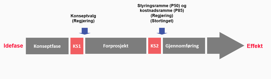 Store statlige investeringsprosjekter skal gjennomføres med følgende faseinndeling: