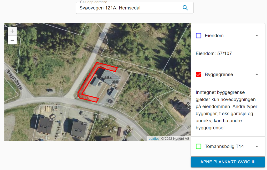 Eksempel på informasjon om en eiendom i Hemsedal kommune med innlagt byggegrense.