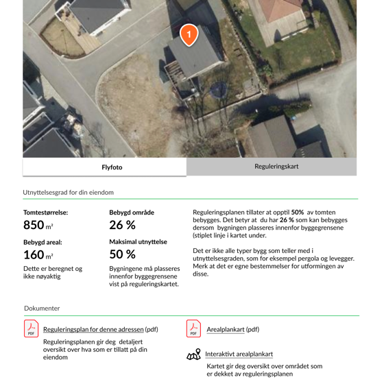 Løsningene viser hvor mye av tomten som er registrert utnyttet, og sammenholder dette med utnyttelsesgrader i bestemmelsene. På denne måten slipper innbyggerne å måtte lete flere steder for å finne denne informasjonen.