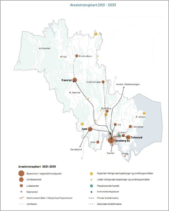 Tønsberg kommune med i underkant av 60.000 innbyggere, reviderte kommuneplanens samfunnsdel i 2021. I denne fastsatte de en arealstrategi med tilhørende kartillustrasjoner.