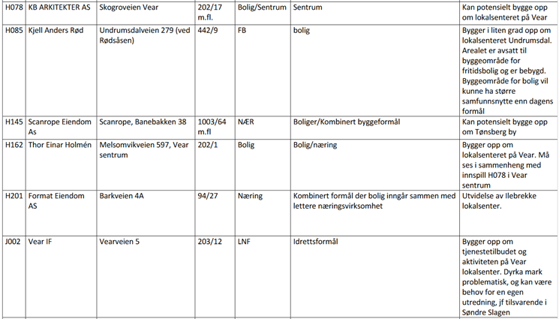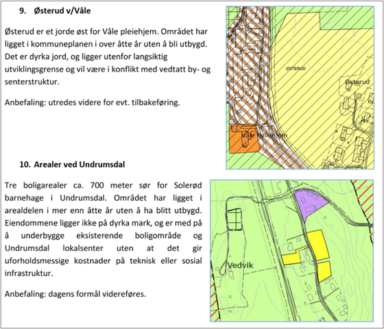 Vurderingen rundt tilbakeføring eller ikke er basert på hvor lenge utbyggingsområdene har ligget inne i planen uten å bli realisert, om det er konsekvensutredet i den tidligere planen, og om arealformålet er i tråd med den nye arealstrategien.