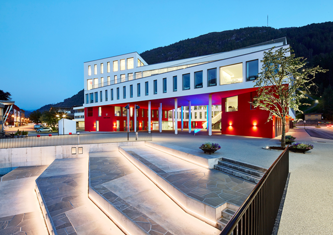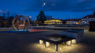 Kongsvingers festplass har fått en oppgradering, og fremstår nå som et attraktivt byrom som inviterer til aktivitet og fellesskap. Belysningen av torget sikrer trygge ferdselsårer, og stimulerer til økt aktivitet på kveldstid. Rådhusets fasade er belyst, og inngangspartier for publikum er fremhevet spesielt. På både torget og fasaden er det lagt vekt på å ivareta god universell utforming for brukerne, samt å velge belysningsløsninger som reduserer energibruk til belysning og uønsket lysforurensning. Lysdesign: Multiconsult.