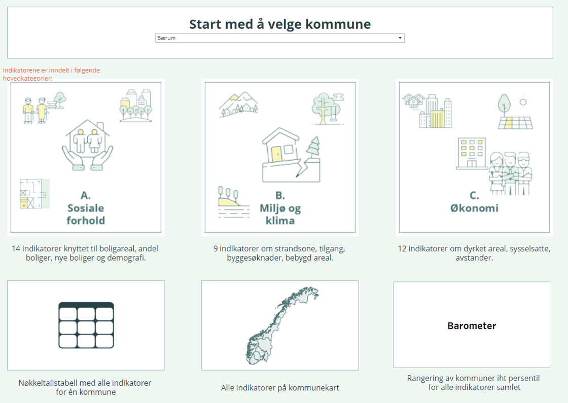 Skjermdump av applikasjonen med indikatorene. Klikk på lenken for å åpne. I applikasjonen velger du kommune og klikker på en av indikatorene.