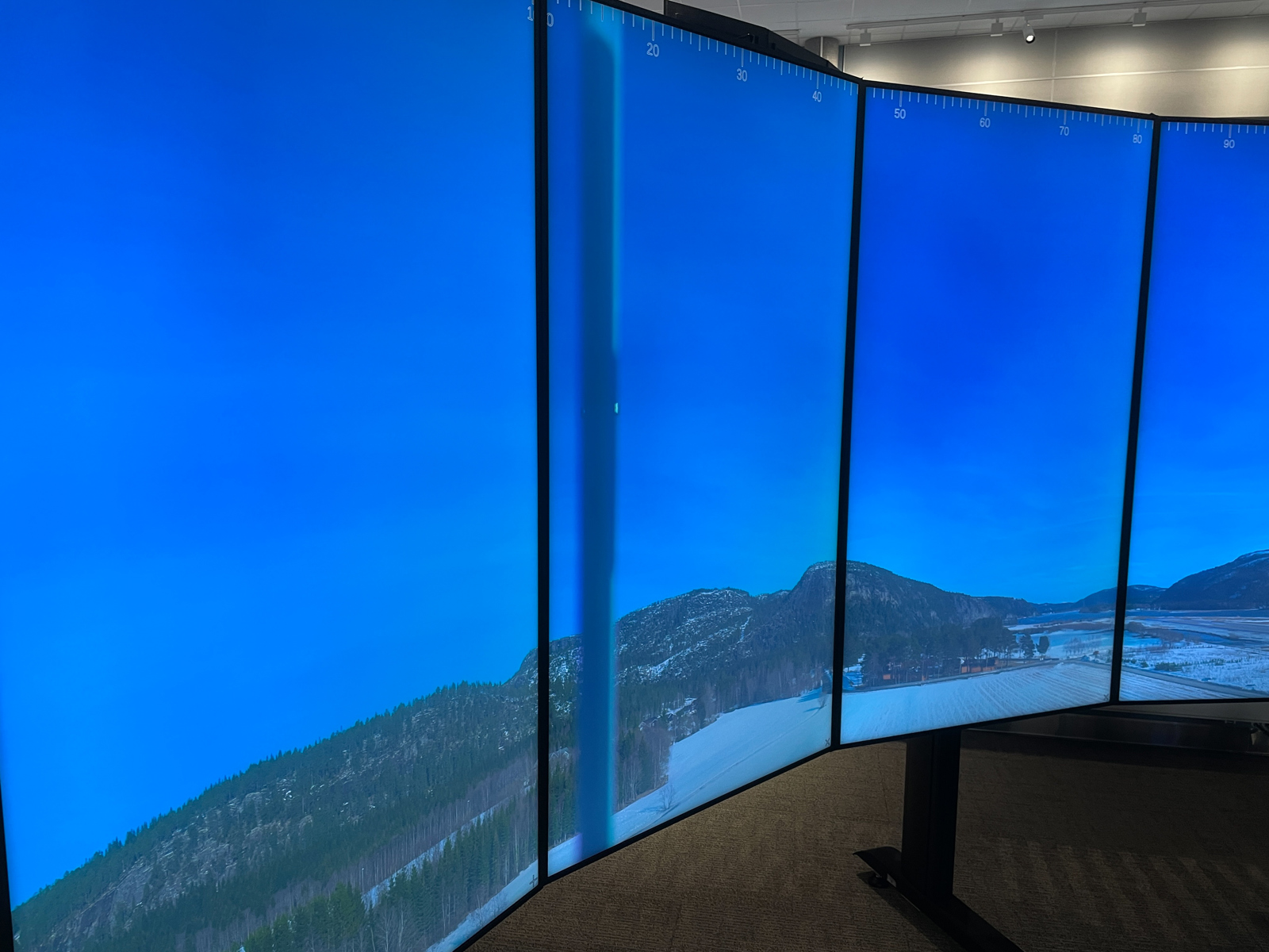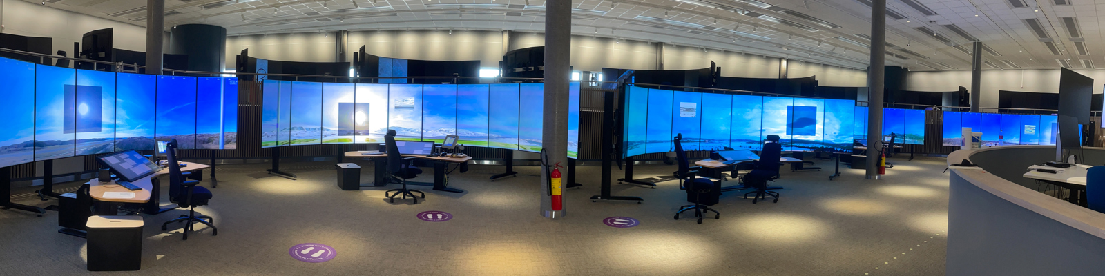 Hver arbeidsplass i Remote Tower i Bodø har ti skjermer som viser 360 graders utsikt over flyplassen. Bildene oppdateres fem ganger per sekund. (Foto: Kjell Brataas/SD)