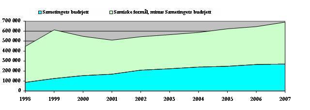 Utviklingen av Sametingets budsjett framkommer av figur 3. Det har vært en stor økning i Sametingets budsjett, særlig de siste årene. Økningen er i stor grad knyttet til at Sametinget har overtatt forvaltningen av en rekke ordninger som tidligere har ligget hos bl.a. departemen-tene. Figur 4 illustrerer utviklingen av bevilgningene til samiske formål totalt sett, korrigert for pris- og lønnsstigning. Figuren er lagd på bakgrunn av tall fra den årlige publikasjonen ”Bevilgninger til samiske formål”. For en detaljert oversikt over hvilke ordninger Sametinget forvalter og når ordningene ble overført, se vedlegg 3. For en detaljert oversikt over bevilg-ninger til samiske formål fra departementene de tre siste årene, se vedlegg 7.