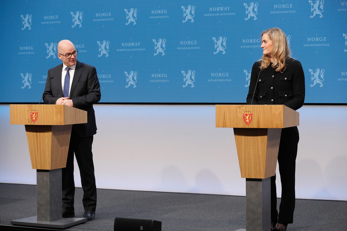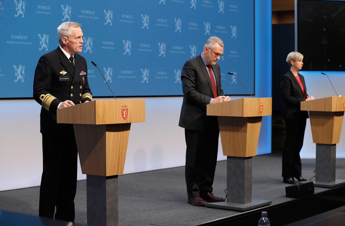 Suodjalusministtar ja justiisa- ja gearggusvuođaministtar álggaheigga preassakonferánssa. Dan maŋŋil ovdanbukte Vákšunbálvalusa (Etterretnings- tjenesten), viseadmirála Nils Andreas Stensønes, (Politiijaid sihkkarvuođabálvalusa (Politiets sikkerhetstjeneste, PST) hoavda, Hans Sverre Sjøvold ja Nationála sihkkarvuođaeiseválddi (Nasjonal sikkerhetsmyndighet, NSM) hoavda, Sofie Nystrøm, iežaset árvvoštallamiid áigeguovdilis sihkkarvuođa- hástalusaid hárrái.