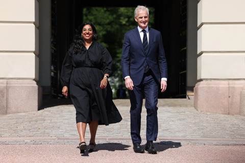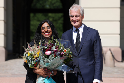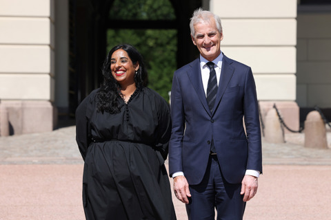 Ny kultur- og likestillingsminister Lubna Jaffery sammen med statsminister Jonas Gahr Støre på Slottsplassen 28. juni 2023. Govva: Torbjørn Kjosvold