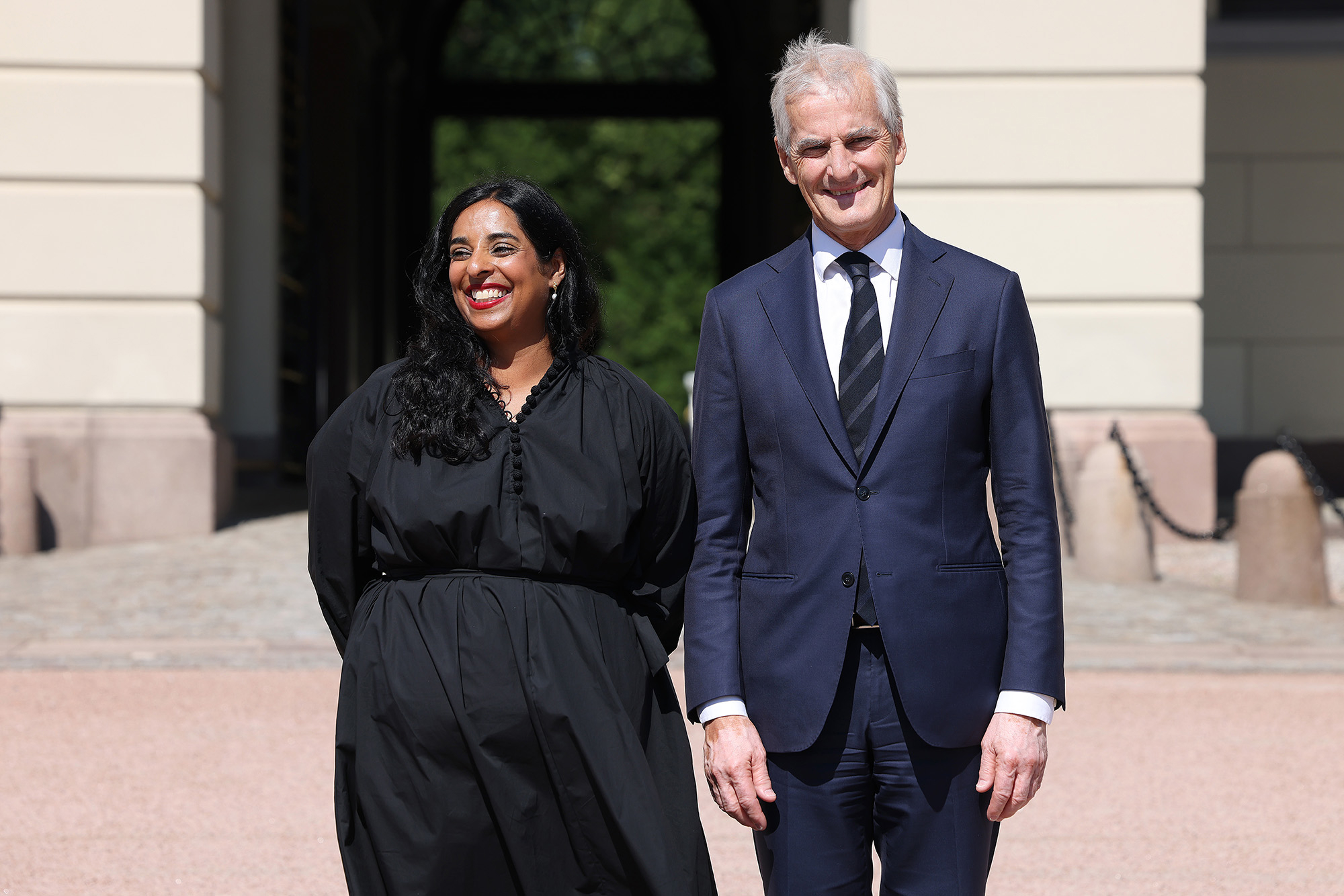 Kultur- og likestillingsminister Lubna Jaffery og Jonas Gahr Støre ute på Slottsplassen etter statsråd 28. juni 2023. Govva: Torbjørn Kjosvold