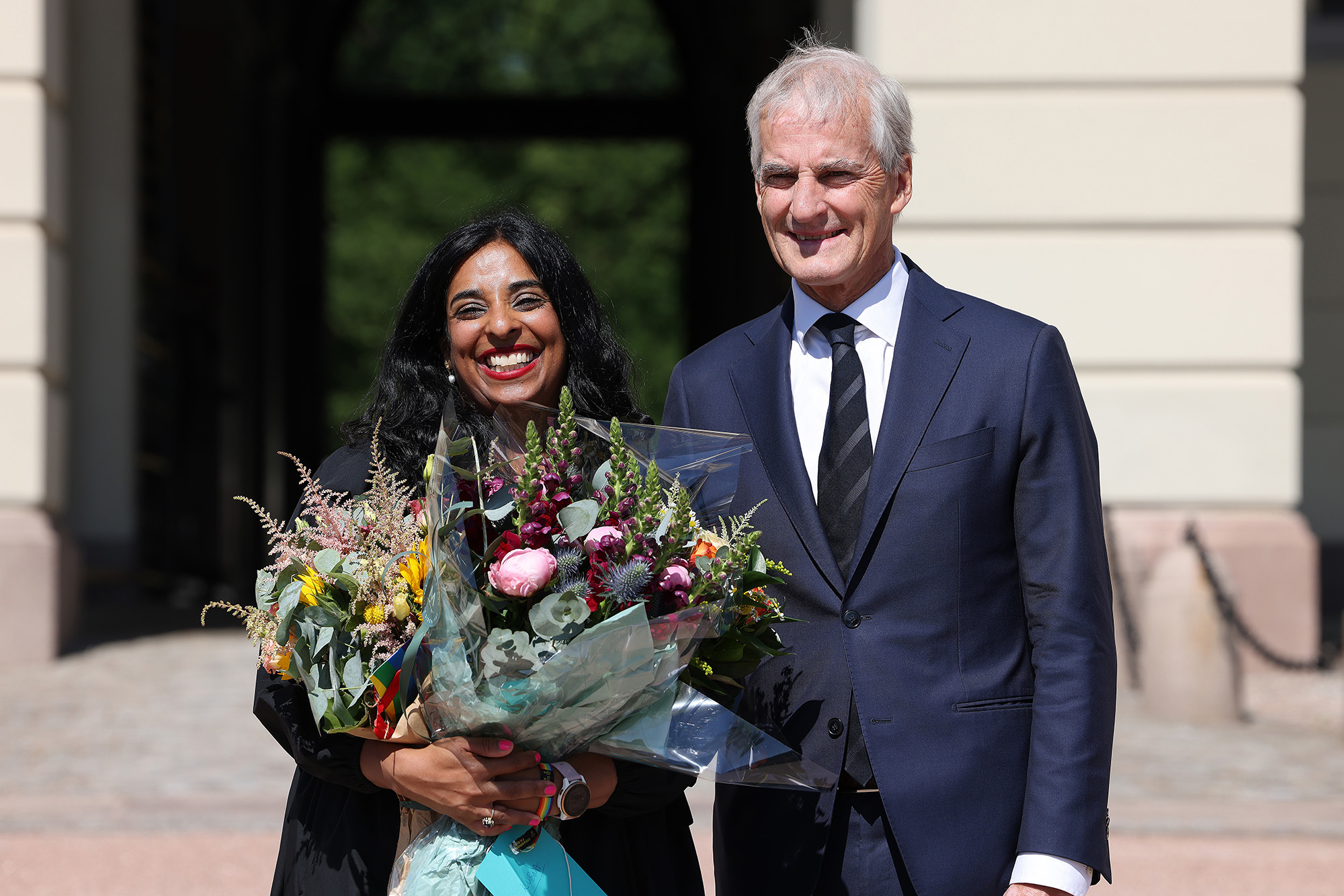 Kultur- og likestillingsminister Lubna Jaffery og statsminister Jonas Gahr Støre på Slottsplassen etter statsråd 28. juni 2023. Govva: Torbjørn Kjosvold