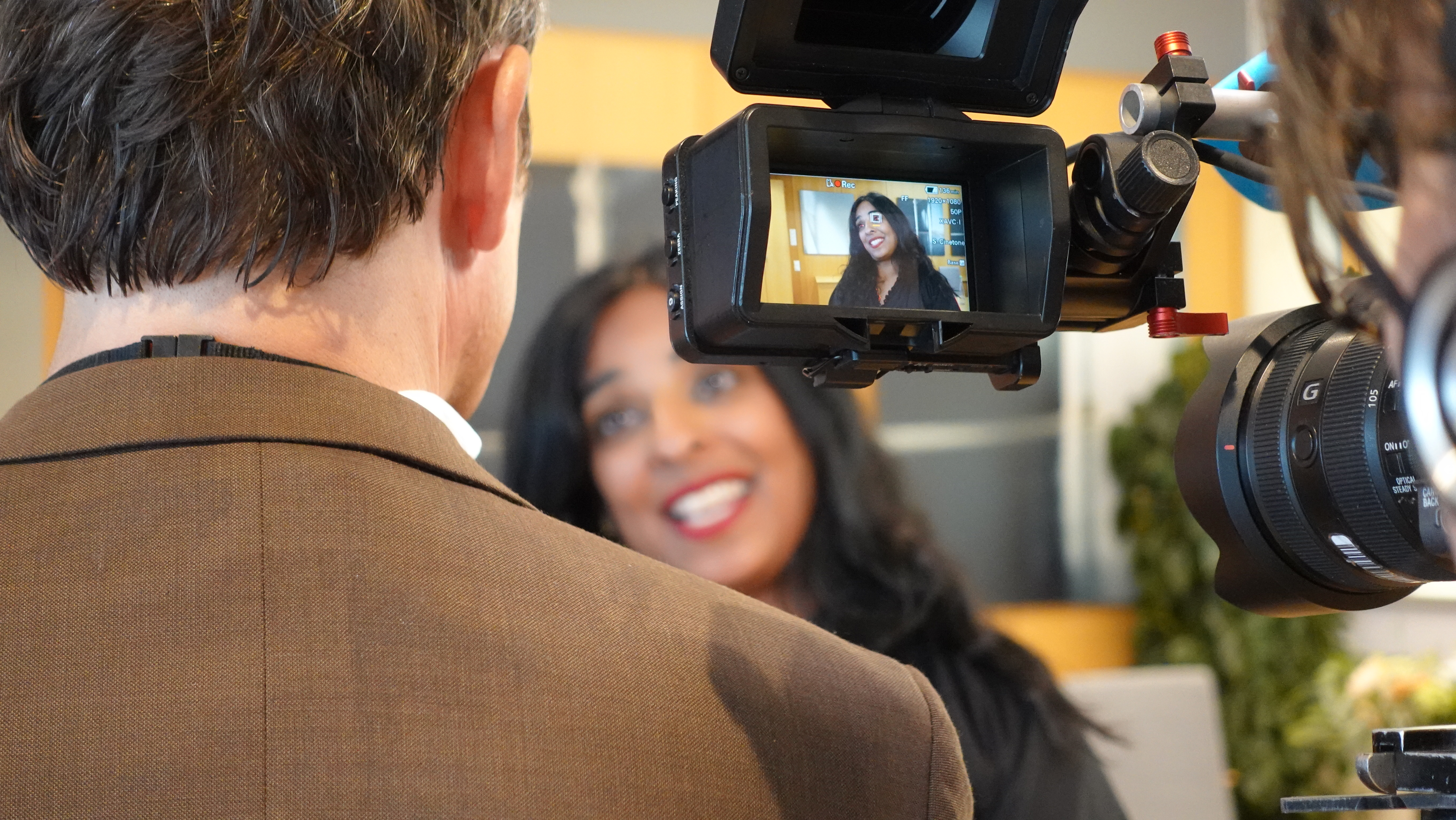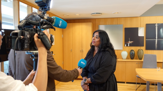 Lubna Jaffery intervjues av NRK under nøkkeloverrekkelsen 28. juni 2023. Govva: KUD