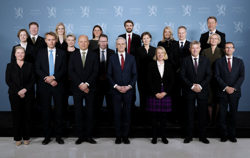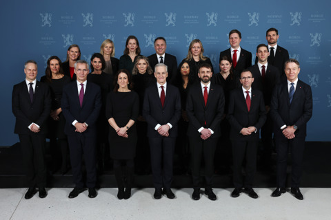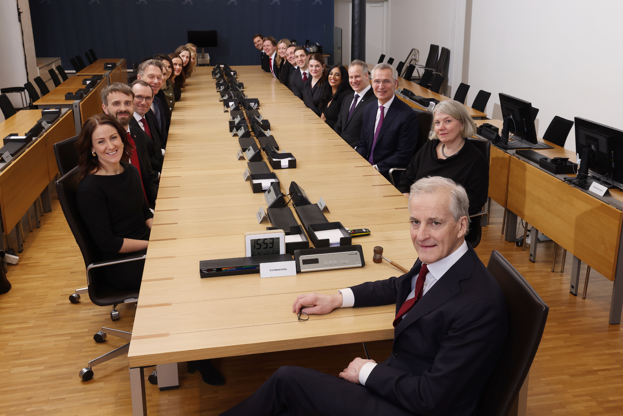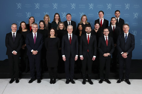 Regjeringen Støre på Sundvolden 5. januar 2026. Første rad fra venstre: Energiminister Terje Aasland, utenriksminister Espen Barth Eide, helse- og omsorgsminister Jan Christian Vestre, statsminister Jonas Gahr Støre, finansminister Jens Stoltenberg, samferdselsminister Jon-Ivar Nygård og kultur- og likestillingsminister Lubna Jaffery. Andre rad fra venstre: Fiskeri- og havminister Marianne Sivertsen Næss, kunnskapsminister Kari Nessa Nordtun, digitaliserings- og forvaltningsminister Karianne Oldernes Tung, kommunal- og distriktsminister Bjørnar Skjæran, næringsminister Cecilie Myrseth og klima- og miljøminister Andreas Bjelland Eriksen. Tredje rad fra venstre: Barne- og familieminister Lene Vågslid, forsknings- og høyere utdanningsminister Sigrun Aasland, justis- og beredskapsminister Astri Aas-Hansen, forsvarsminister Tore O. Sandvik, arbeids- og inkluderingsminister Kjersti Stenseng, utviklingsminister Åsmund Grøver Aukrust og landbruks- og matminister Nils Kristen Sandtrøen. Govva: Torbjørn Kjosvold / Forsvaret